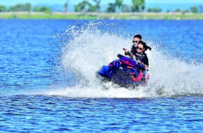黑龙江哈尔滨松花江一处江面,游客在体验摩托艇项目。新华社发