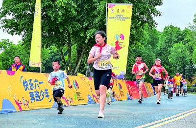 四川眉山,家长和孩子在参加“六一”亲子跑活动。新华社发