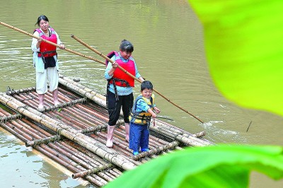 在云南景洪市基诺山基诺族乡,家长和孩子体验竹筏划船。新华社发