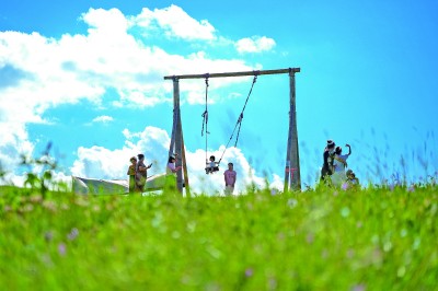 游客在新疆昭苏县伊昭公路沿线游玩。新华社发