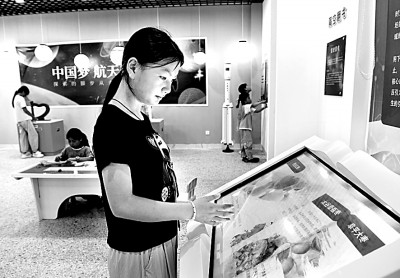 暑假,山东枣庄山亭区龙虎村小学生在科普体验中心体验“隔空翻书”。新华社发