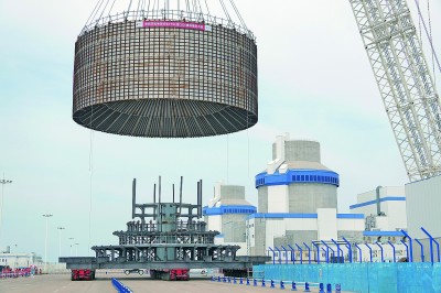 8月4日,国家电投山东海阳核电站3号机组核岛CB20模块顺利吊装就位,标志着该机组大型模块全部吊装完成,开始进入设备安装调试阶段。据了解,建设中的海阳核电3、4号机组是国家“十四五”规划重点项目,计划2027年全面投运。图为当日拍摄的吊装现场。 新华社发
