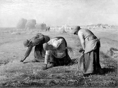 米勒展现了一种对于那个时代的学院派来说既熟悉又陌生的技巧,让画中人物虽然面目模糊,服装粗陋,轮廓简单,却依然获得了古典主义式的庄严。在柔和巧妙的色彩对比中,他的主人公没有一处清晰的细节,他们深深地弯着腰,却比任何学院派的神仙或君主更显得有仪式感,如有光晕一般,甚至不亚于学院派最推崇的拉斐尔本人作品中的人物。