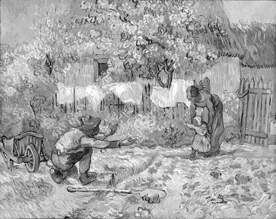 对于梵高和高更,农民则是至关重要的主题。梵高本人正是米勒的铁杆粉丝,他有名的《播种者》《午休》《第一步》等都来自对米勒作品的临摹。他从不掩饰自己对米勒或布雷顿的热爱,有时完全照搬其构图和主题,但梵高式风格鲜明的色彩和笔触使得这种再创作成就了全新的作品。