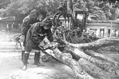 8月6日,工作人员在广东肇庆鼎湖区鼎湖山风景区门口用电锯切割被冲倒的树木。新华社记者 肖恩楠摄