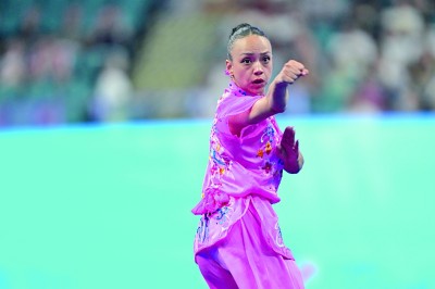 女子长拳决赛现场,外国运动员展示中国武术的魅力。本报记者 陈城摄/光明图片