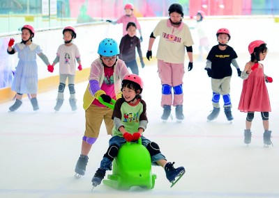 酷暑热浪催热“清凉经济”。图为小朋友们在江苏南京一处室内滑冰场滑冰。新华社发