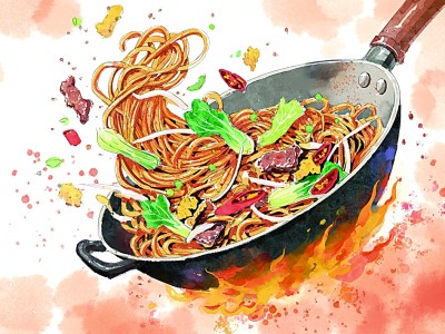 铁锅烧热下油,尤以猪油为佳,敲入鸡蛋,用锅铲快速打散,放入瘦肉,炒至快变色时,加入豆芽、干辣椒翻炒至七八成熟,随着一勺勺干辣椒下锅,被激发出来的辣味裹挟在烟火气中。米粉下锅后,再加入生抽、老抽、蚝油、盐、鸡精等,持续翻炒至米粉干香,洒点米酒,这样,香味就更浓了。为避免米粉粘锅,要全程保持大火,翻炒要快速,晶莹的米粉、金黄的蛋花、翠绿的青菜在铁锅里上下翻飞,一口铁锅也被颠得虎虎生风。最后撒入葱花,装盘出锅!