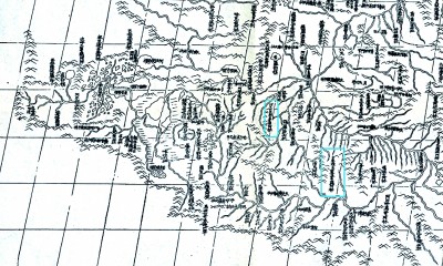 清初使用地图投影和经纬度绘制的康熙《皇舆全览图》,首次以我们今天熟悉的方式对河源地进行了细致的描绘,并把河源从星宿海延伸到其上游的阿尔坦河。该图有汉文和满汉多种谱系图。按照德国学者福克司整理的汉文标注版,存有两张河源图,旧河源图(图②)上重在表示河源区,标出黄河源头支流阿拉坦河及其发源地巴颜喀拉山、查灵鄂模(扎陵湖)、鄂灵鄂模(鄂陵湖),但自此以下绘制比较粗糙,甚至没有标示黄河在阿尼玛卿山的大拐弯,反映的是康熙四十三年(公元1704年)拉锡、舒兰等第一次考察河源的情况。新的河源图(图③)是康熙五十六年(公元1717年)楚尔沁藏布和胜住等考察的结果。此图不仅标出黄河正源阿尔坦必拉、查灵鄂模、鄂伦鄂模等地,而且完整绘制了黄河在今阿尼玛卿山的大拐弯,并在此自西到东分别标出了乌兰莽乃阿林、古鲁板乌蓝温多罗阿林、阿木你马勒产母孙阿林等山名,其中最为醒目的古鲁板乌蓝温多罗阿林,释为三个红高山之意,其来源仍可追溯到秦汉时期意指三重高山的昆仑的含义,只不过该地名由蒙古语专名与满文通名构成。