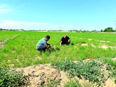 巴彦淖尔市磴口县防沙林林业管护中心工作人员在梭梭育苗田里除草。本报记者 杨桐彤摄/光明图片
