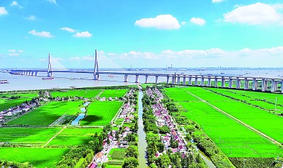 8月14日,俯瞰长江岸边的江苏省张家港市冶金园(锦丰镇)新港村,稻田、河流、村庄与沪苏通长江公铁大桥相映成辉,长江生态画卷徐徐展开。施柏荣摄/光明图片