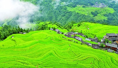8月13日,贵州省黔东南苗族侗族自治州从江县加榜乡加车村,层层叠叠的梯田间云雾缭绕,错落的民居与蜿蜒的公路若隐若现,构成一幅灵动的山水田园图景。卢忠南摄/光明图片