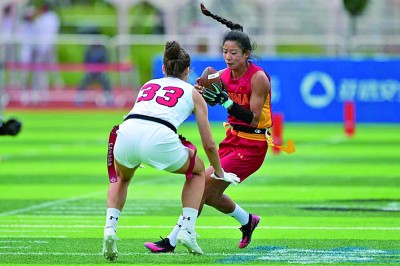 8月14日,在腰旗橄榄球的首个比赛日,中国金花(右)迎来历史首秀。本报记者 陈城摄/光明图片