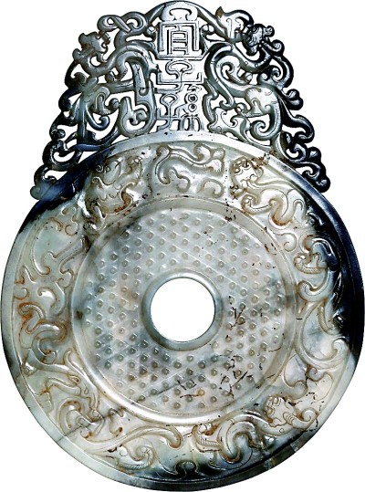 东汉“宜子孙”玉璧,是我国迄今发现的形制最完整、体积最大、质地最优且艺术价值极高的同款铭文大型玉璧。玉璧出廓处镂雕双龙纽。纽中央透雕篆书“宜子孙”三字堪称点睛之笔。“长宜子孙”是汉代常见的吉语。从这块珍贵的玉璧也能看出,祈愿子孙昌盛、家族兴旺是中华民族自古以来的美好愿望。