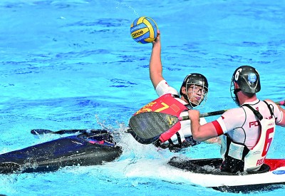 8月16日,中国队球员史炜杰(后)在皮艇球男子决赛第七名争夺赛中。新华社记者 李嘉南摄