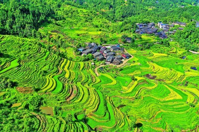 8月16日,广西融水苗族自治县白云乡高孝苗寨,梯田与公路、吊脚楼及青山相互映衬,构成一幅美丽的生态画卷。