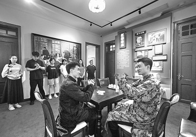 今年以来,位于天津市和平区的吉鸿昌旧居推出沉浸式展演《国魂》,演员以整栋旧居为舞台,通过实景演绎,让观众更好地感受吉鸿昌将军的爱国情怀与理想信念。图为8月16日,观众在观看表演。新华社记者 李然摄