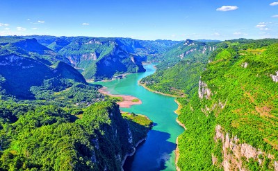 8月17日,位于贵州省黔西市、金沙县以及修文县三县(市)交界处的乌江上游荆江段,碧水青山交相辉映,构成一幅壮美的山水生态画卷。
