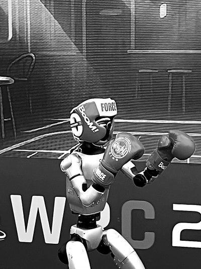 上步、闪避、刺拳……格斗场地内,戴护具的机器人拳击手使出一套精彩的格斗连招,让观众大呼过瘾!