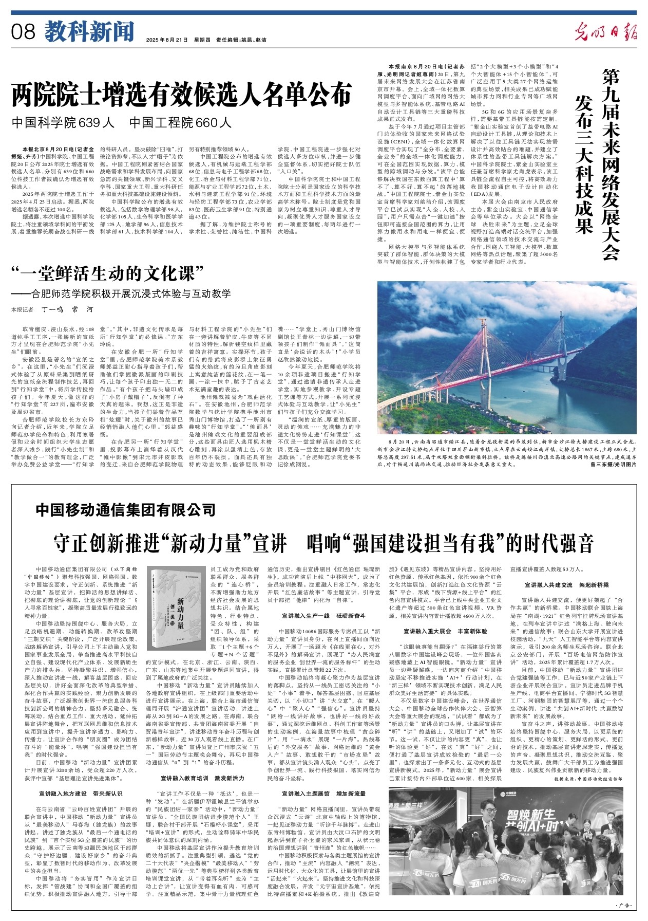 本报南京8月20日电(记者苏雁、光明网记者姬尊雨)20日,第九届未来网络发展大会在江苏省南京市开幕。会上,全域一体化数算网调度平台、面向广域网的网络大模型与多智能体系统、基带电路AI自动设计工具链等三大重磅科技成果正式发布。