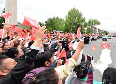 8月20日中午,中共中央总书记、国家主席、中央军委主席习近平率中央代表团乘专机抵达拉萨,出席西藏自治区成立60周年庆祝活动。习近平等从机场乘车到住地途中,各族群众在街道两旁热情欢迎。新华社记者 高洁摄