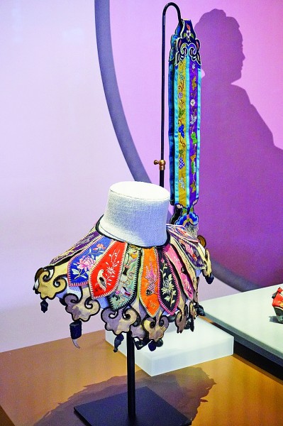 云肩主体由多片彩绣织物拼接成花瓣状,运用包梗绣等技法制成。披肩之上,盛放的牡丹象征富贵荣华;灵动的鸟儿或比翼双飞,或啼鸣枝头,寓意夫妻和睦、家庭美满;金鱼谐音“金玉”,菊花暗合“久长”……