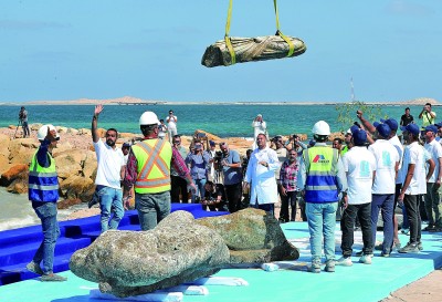 8月21日,埃及旅游和文物部在亚历山大附近的阿布基尔湾地中海水域打捞出三件大型石刻雕像,包括一尊残缺的狮身人面像、一尊断颈断膝的托勒密时代晚期人物雕像,以及一尊白色的罗马贵族大理石雕像。图为在埃及亚历山大附近的海滨,工作人员帮助安放被打捞出水的石刻雕像。新华社发