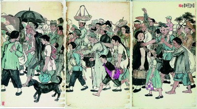 张安治的三联画《避难群》,表现的是在日军空袭预警中紧急避难的桂林百姓。近四十名男女老幼簇拥成惊惶的人流,每个人都被赋予了独特的外貌特征与情感状态。盲人拄杖、妇女抱儿、孩童牵母、主仆相扶,或顶篮、或提箱、或挑担、或背包,步履慌乱间,生活的重量和命运的无常一并压在肩头。而那些粗布衫下绷紧的肌肉线条,因急促呼吸而鼓胀的衣襟褶皱,亦在烘托紧张不安的气氛。画面最左侧,画家描绘了一位回望的妇女,在她的脚边还有一只紧紧追随的黑狗,其忠诚天性令人感慨。妇人的视线让人不禁想象:她在望什么?是身后已经看不见的家人,还是远处那可能永远回不去的家?这是对家、对故乡本能眷恋的一望,然而,她身后已无家可回,身前其实也无路可走。