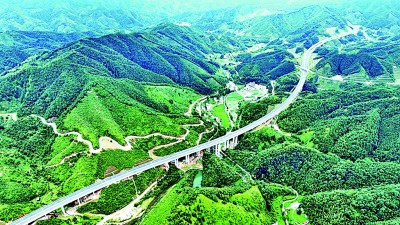 8月26日,江西遂(川)至大(余)高速公路如银龙穿梭于苍翠的赣南山峦间,与稻田、村居相映成画。李建平摄/光明图片
