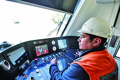 在签约仪式上,智利国家铁路公司一名员工在列车驾驶室内工作。新华社发