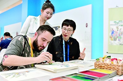 8月29日,在上合组织峰会新闻中心非遗互动区,外国记者(左)体验制作天津杨柳青木版年画。新华社发