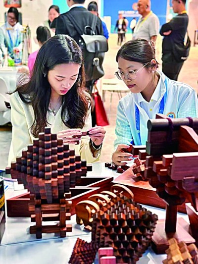 8月30日,记者在新闻中心体验天津非物质文化遗产传统木工榫卯技艺。本报记者 张云摄/光明图片