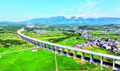 8月30日,湖南省永州市宁远县鲤溪镇境内,建设中的桂(东)新(田)高速桂阳至新田(宁远)段如一条蜿蜒盘旋的银色巨龙,与民居、田园、云雾相映成景,壮美如画。刘贵雄摄/光明图片