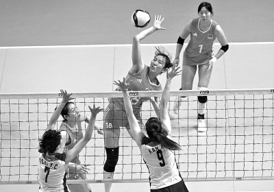 8月31日,在香港伊利沙伯体育馆举行的2025亚洲东区女子排球锦标赛决赛中,中国队3比1战胜中国台北队,获得冠军。图为中国队球员单琳倩(左三)在比赛中扣球。新华社发