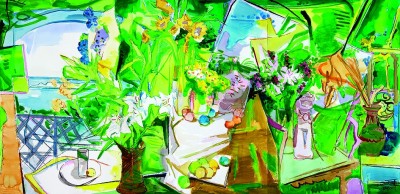 于是,我有了创作灵感,想将这一瞬间定格。我将花团锦簇的农家作为前景,透过五彩缤纷的花丛可以远眺富春江,勾勒出一派新富春胜景。水色流转间,既有花的烂漫,水的灵秀,更承载着人们对幸福生活的美好愿景——春江这边独好,是我作为今天生活在富春江畔的人的至诚表达。