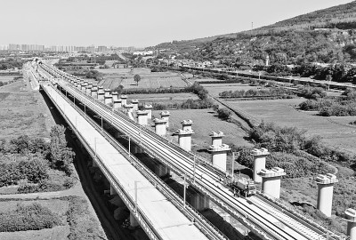 9月8日,在西十高铁建设现场西安东至蓝田作业区间,施工人员将首对500米长的无缝钢轨平稳铺设在无砟轨道板上,标志着由西成客专陕西公司建设、中铁四局施工的西十高铁全线铺轨正式启动。西十高铁西起陕西省西安市,向东南穿越秦岭山脉,终点为湖北省十堰市,正线全长255.76公里,设计时速350公里。图为施工车辆在西十高铁西安东至蓝田区间铺设无缝钢轨。新华社记者 李一博摄