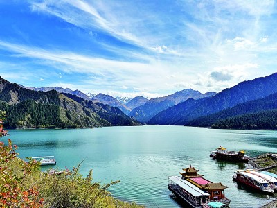 9月10日,新疆昌吉天山天池风景区湖水清澈湛蓝,四周群山环抱,迎来金秋赏景佳季。本报记者 林卫光摄/光明图片