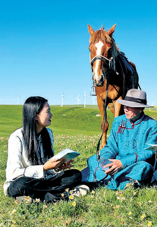 在内蒙古乌兰察布,占淑莹律师在草原上与牧民交流。资料图片