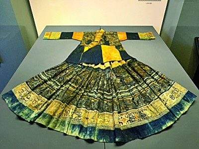 这套鹭鸟纹彩色蜡染褶裙,曾穿在谁的身上呢?1987年,贵州省博物馆考古队在安顺平坝桃花村苗族洞葬遗址进行考古发掘时,在第415号棺中发现了这套彩色蜡染褶裙,袖口处放着一把蜡染刀。
