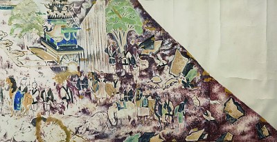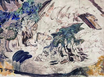 我们发现,此幅临摹作品和同时期另外一批画作都采用了中国画颜色与水彩颜色相结合的方式进行绘制。两位艺术家在简单的炭笔定形后直接上色,几乎一次性完成了整幅画面的临摹,体现出他们在构图布局方面的极强能力。在画面中看不到犹豫和拖泥带水,壁画的内容和历史遗留的痕迹在临摹作品中浑然一体。这样潇洒的笔触,一方面体现出两位画家对魏晋壁画神韵的追求,力求在用笔上复原壁画的绘制方法,尤其是体现壁画的勾勒与敷彩;另一方面可以看出两位画家对于用笔的把控能力,陆鸿年擅长中国古典人物画,戴泽则是美院教师中素描功底极强的一位,当时刚刚从欧洲工作一年归国不久,醉心于现实主义创作,在造型和色彩方面都有了新的提高。两位画家通过细腻精到的笔触还原了斑驳墙壁的复杂变化,使得画面生气十足。