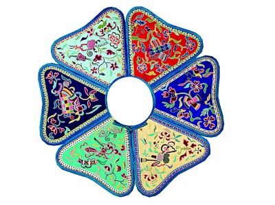 这件清代各色缎绣花卉杂宝纹云肩,长35厘米、宽34厘米,以六色缎为地,采用打籽绣绣杂宝花蝶纹,拼贴缝缀成六垂云形。杂宝纹是我国传统装饰纹样,由两种以上有着吉祥寓意的宝物纹样组成,因无定式,任意组合,故称“杂宝”。此件云肩饰有方胜、灵芝、书、笔、磬、葫芦、宝扇等传统吉祥纹样,蕴含着人们对美好生活的向往与追求。其颜色分为红、蓝、黄、绿、紫、月白六色,边饰共三层,其中两层为丝织花边,六片各有不同,最外层为素蓝色缎包边,六片皆同。绣作造型别致,色彩艳丽,纹饰丰富,工艺精巧。