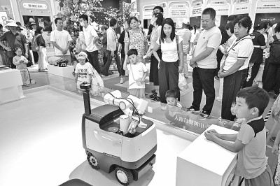 9月14日,2025年服贸会在北京落下帷幕。图为观众观看配送机器人。  新华社记者 李鑫摄