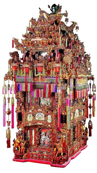 婚轿多属彩结贳器店所有。万工轿诞生于民国初年,由上海滩的“聚成号”贳器店打造而成。范珮玲介绍,战争期间,店主将轿子拆解成400多个花片,分装在13个大箱中,运回宁波老家妥善安置。20世纪50年代,被浙江省博物馆收藏。