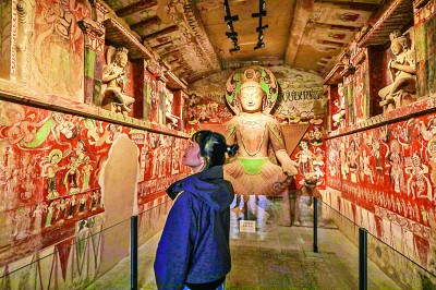 壁画色彩绚丽浓重,彩塑形象丰腴祥和……站在复原临摹的莫高窟第172窟前,盛唐气象扑面而来。