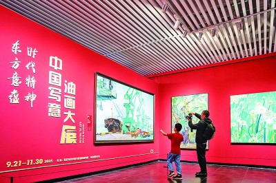 9月21日,“东方意蕴·时代精神——中国写意油画大展”在长沙李自健美术馆开展,共展出了全国老、中、青三代逾百位画家的229幅油画作品。图为参观者在观看、拍摄展出的画作。新华社记者 陈思汗摄