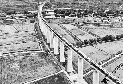 秋日,内蒙古鄂尔多斯市准格尔旗黄河两岸稻田成片,一派丰收景象。图为9月22日,一列火车经过内蒙古准格尔旗的稻田。新华社记者 贝赫摄