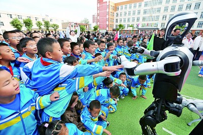 9月25日,甘肃省定西市安定区西关小学举办校园科技节活动,现场通过科普讲解、互动体验、科普展览等,让学生们近距离感受科技的魅力。图为学生和人形机器人互动。王克贤摄/光明图片