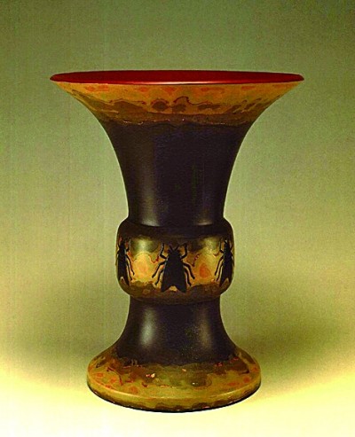 以沈福文创作的“绿彩嵌金六蝉堆漆脱胎花瓶”为例。该作品运用了高堆漆与研磨彩绘相结合的装饰技法。艺术家先将夏蝉图案拓印在底漆上,再在图案的轮廓线内平涂黑漆,并将炭粉均匀地撒在漆面上,而后放入荫房,待炭粉充分沉淀、吸收直至完全干燥后,便可扫去多余的粉末。接着于其上涂刷加入了稀释剂的生漆,待干燥后再用砂纸进行打磨。如此反复几十次后,夏蝉图案便呈现出如浮雕般的立体感。