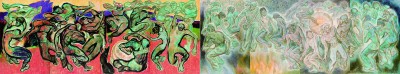 油画《生命的归宿与起点之舞——跳丧·摆手》由唐小禾、程犁夫妇于1983年创作,曾获第六届全国美展优秀作品。该作高近2米,长达10米,观念表达隽永思辨,情感传递浓烈质朴,艺术风格浪漫狂放,是两位艺术家重要的代表作。