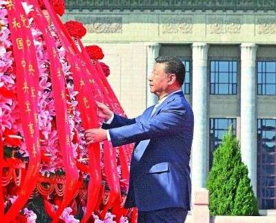 习近平迈步上前,仔细整理花篮缎带。随后,习近平等党和国家领导人缓步绕行,瞻仰人民英雄纪念碑。